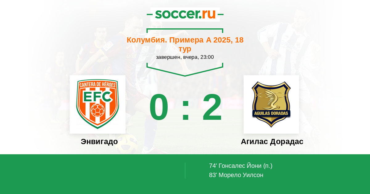 Колумбия. Примера А 25.10.2023 Агилас Дорадас Логотип футбольный клуб Агилас Дорадас (Рионегро) 3:1 Логотип футбольный клуб Энвигадо Энвигадо