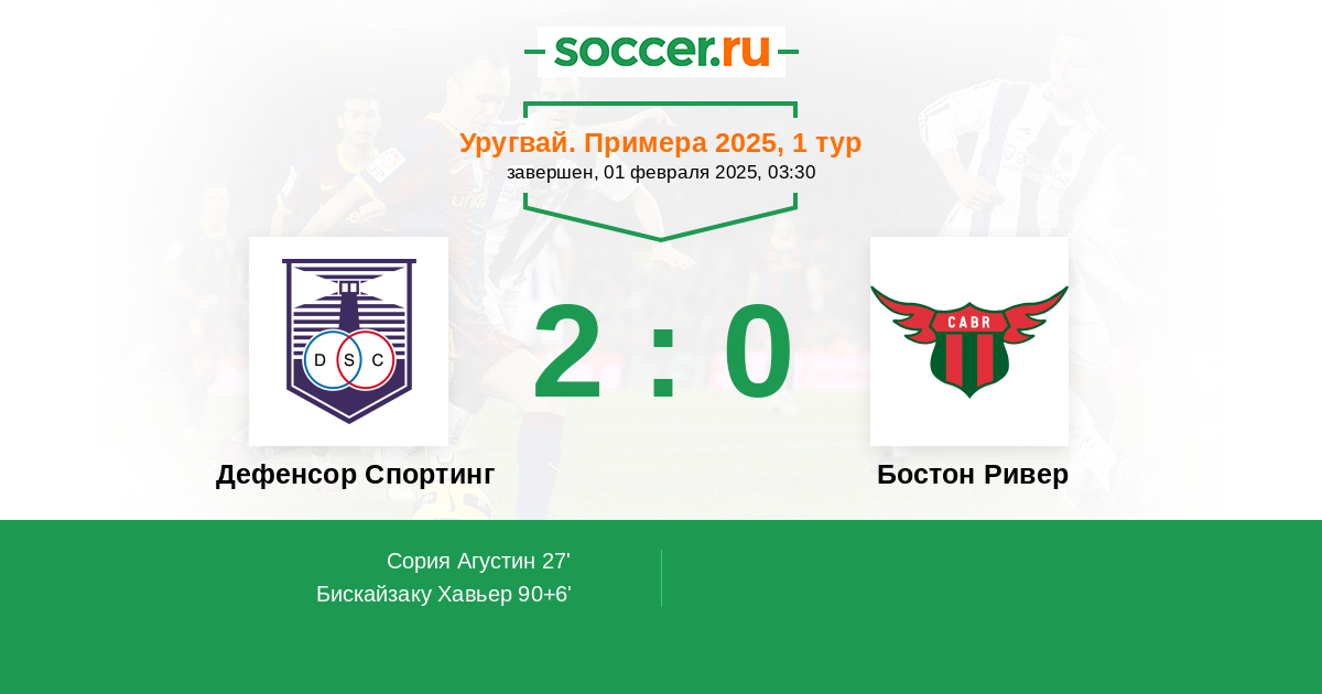 Уругвай. Примера A 03.08.2025 Бостон Ривер Логотип футбольный клуб Бостон Ривер (Монтевидео) 4:0 Логотип футбольный клуб Дефенсор Спортинг (Монтевидео) Дефенсор Спортинг