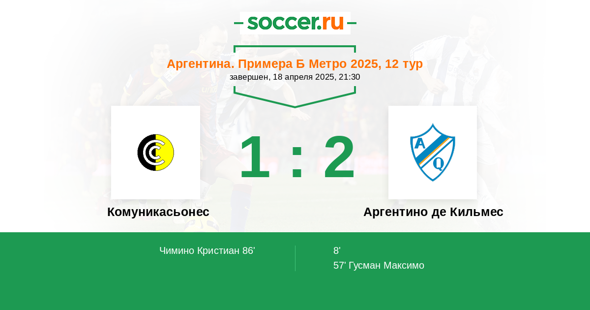 Аргентина. Примера Б Метро 18.04.2021 Комуникасьонес Логотип футбольный клуб Комуникасьонес (Буэнос-Айрес) 2:0 Логотип футбольный клуб Аргентино де Кильмес Аргентино де Кильмес