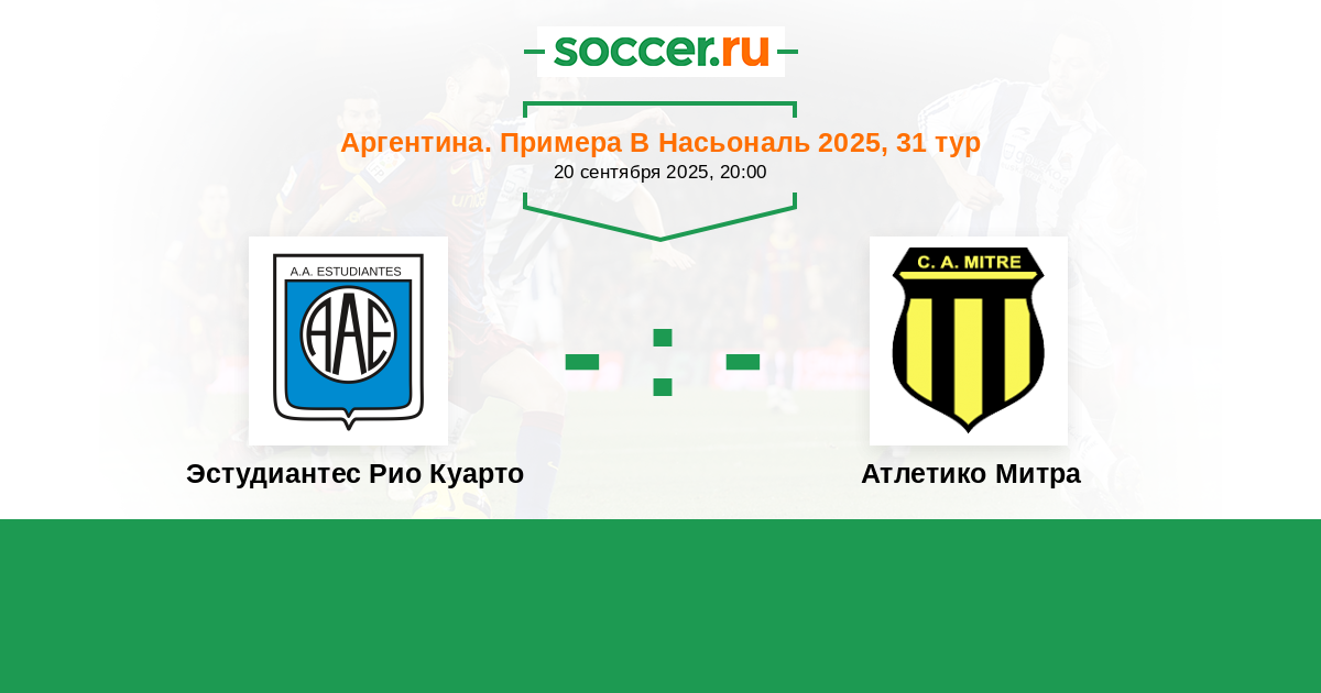 Аргентина. Примера Б Насьональ 22.09.2019 Эстудиантес Рио Куарто Логотип футбольный клуб Эстудиантес Рио Куарто 0:0 Логотип футбольный клуб Атлетико Митра (Сантьяго-дель-Эстеро) Атлетико Митра
