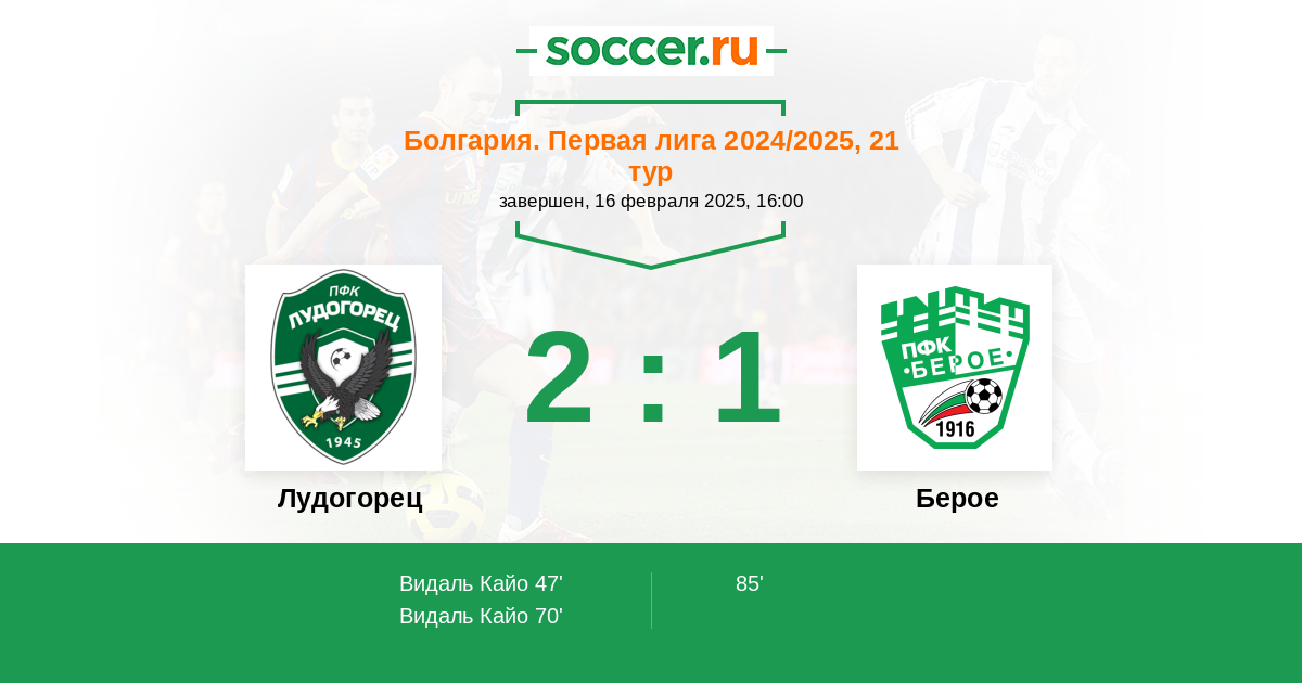 Болгария. Первая лига 26.02.2024 Берое Логотип футбольный клуб Берое (Стара-Загора) 0:2 Логотип футбольный клуб Лудогорец (Разград) Лудогорец
