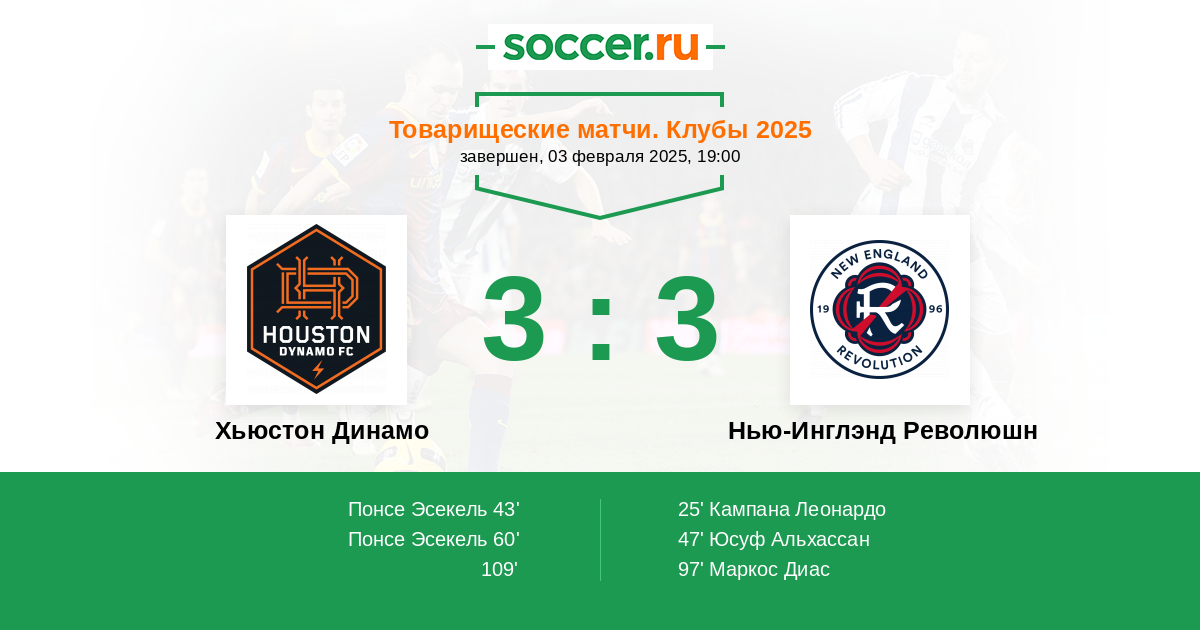 Товарищеские матчи. Клубы 31.01.2026 Нью-Инглэнд Революшн Логотип футбольный клуб Нью-Инглэнд Революшн (Фоксборо) 2:3 Логотип футбольный клуб Хьюстон Динамо Хьюстон Динамо