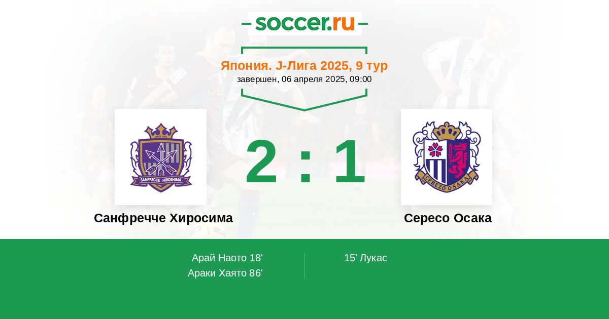 Япония. J-Лига 1 21.04.2006 Санфречче Хиросима Логотип футбольный клуб Санфречче Хиросима 1:1 Логотип футбольный клуб Сересо Осака Сересо Осака
