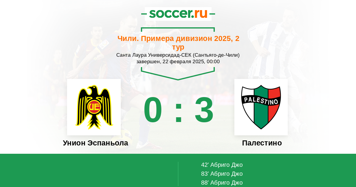 Чили. Примера дивизион 27.07.2025 Палестино Логотип футбольный клуб Палестино (Сантьяго) 1:0 Логотип футбольный клуб Унион Эспаньола (Сантьяго) Унион Эспаньола