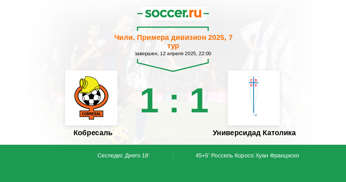 Чили. Примера дивизион 30.07.2016 Универсидад Католика Логотип футбольный клуб Универсидад Католика (Сантьяго) 1:1 Логотип футбольный клуб Кобресаль (Эль-Сальвадор) Кобресаль