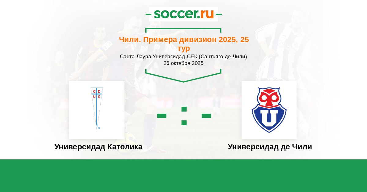 Чили. Примера дивизион 04.10.2020 Универсидад Католика Логотип футбольный клуб Универсидад Католика (Сантьяго) 3:0 Логотип футбольный клуб Универсидад де Чили (Сантьяго) Универсидад де Чили