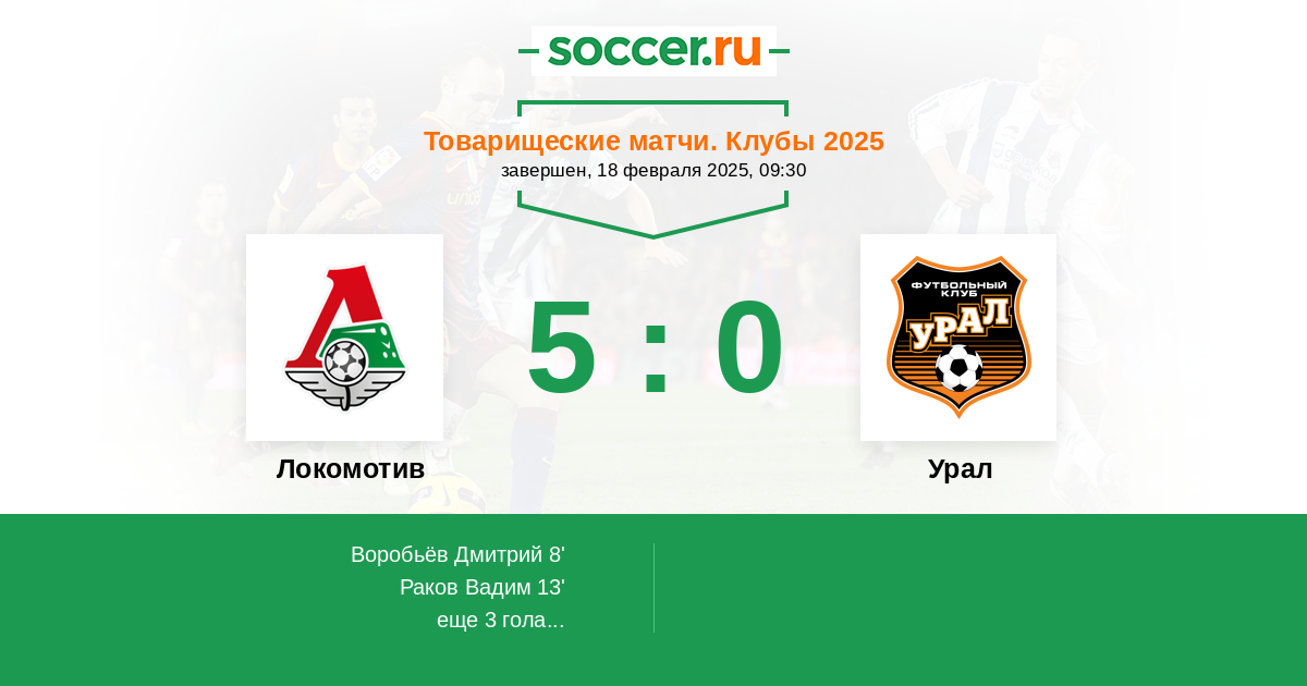 Товарищеские матчи. Клубы 18.02.2025 Локомотив Логотип футбольный клуб Локомотив (Москва) 2:2 Логотип футбольный клуб Урал (Екатеринбург) Урал
