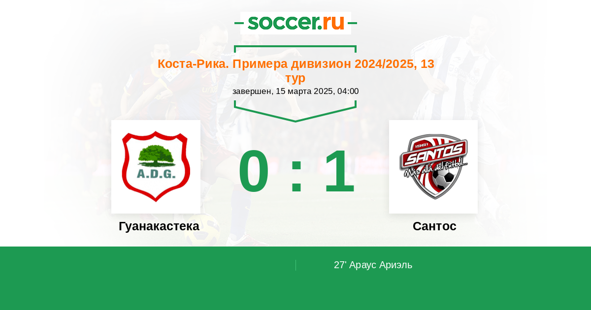 Коста-Рика. Примера дивизион 21.10.2024 Сантос Логотип футбольный клуб Сантос (Гуапилес) 4:0 Логотип футбольный клуб Гуанакастека (Никойя) Гуанакастека