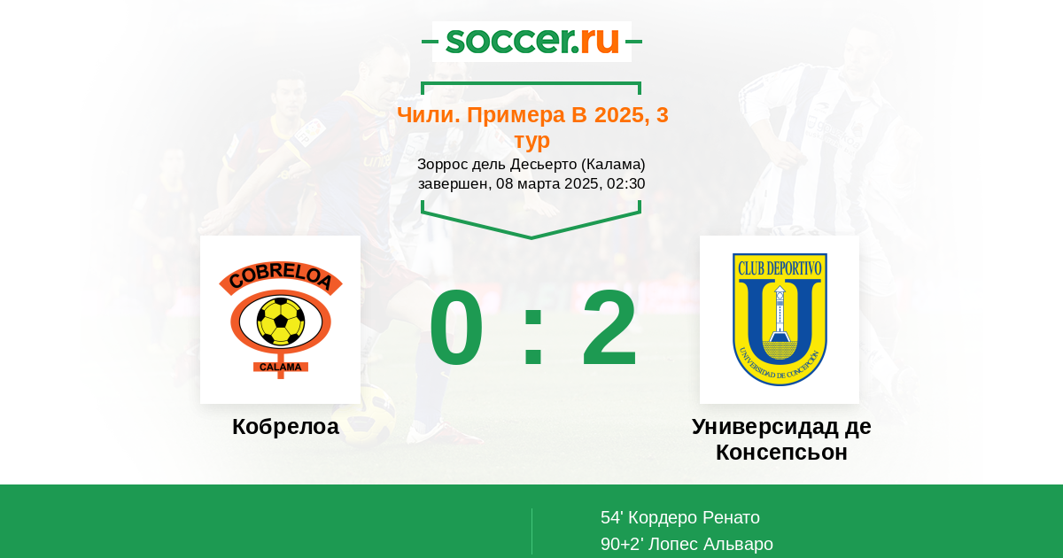 Чили. Примера В 15.03.2023 Кобрелоа Логотип футбольный клуб Кобрелоа (Калама) 2:1 Логотип футбольный клуб Универсидад де Консепсьон Универсидад де Консепсьон