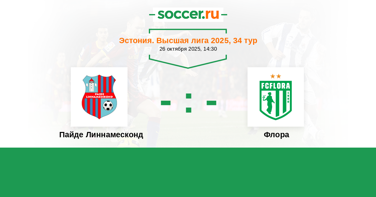 Эстония. Высшая лига 28.10.2023 Флора Логотип футбольный клуб Флора (Таллин) 2:1 Логотип футбольный клуб Пайде Линнамесконд Пайде Линнамесконд