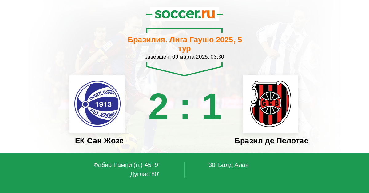 Бразилия. Лига Гаушо 23.02.2025 Бразил де Пелотас Логотип футбольный клуб Бразил де Пелотас 2:3 Логотип футбольный клуб ЕК Сан Жозе (Порту-Алегри) ЕК Сан Жозе