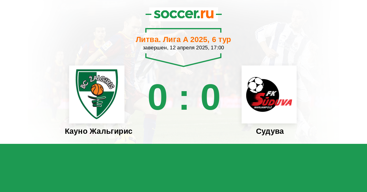 Литва. Лига А 24.09.2025 Кауно Жальгирис Логотип футбольный клуб Кауно Жальгирис (Каунас) 1:1 Логотип футбольный клуб Судува (Мариямполе) Судува