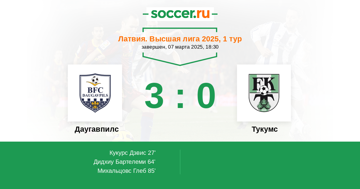 Латвия. Высшая лига 30.03.2024 Даугавпилс Логотип Даугавпилс 3:1 Логотип футбольный клуб Тукумс Тукумс