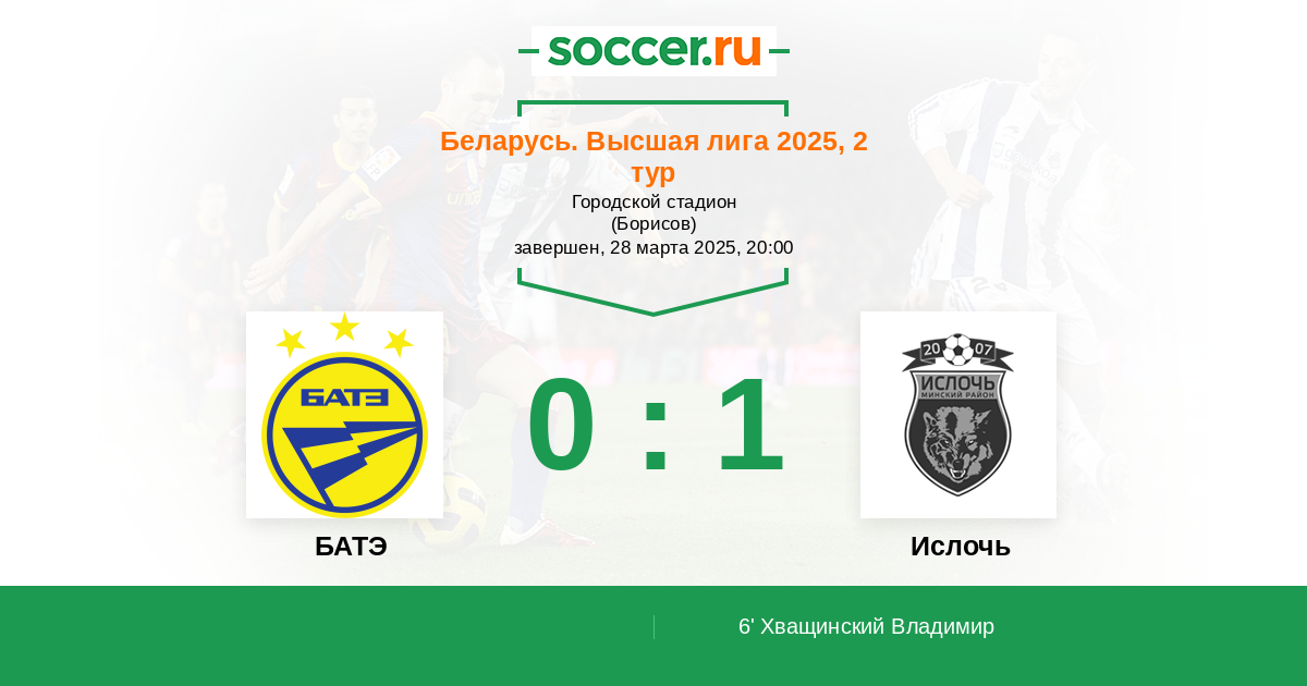 Беларусь. Высшая лига 31.05.2020 БАТЭ Логотип футбольный клуб БАТЭ (Борисов) 1:0 Логотип футбольный клуб Ислочь (Минск) Ислочь