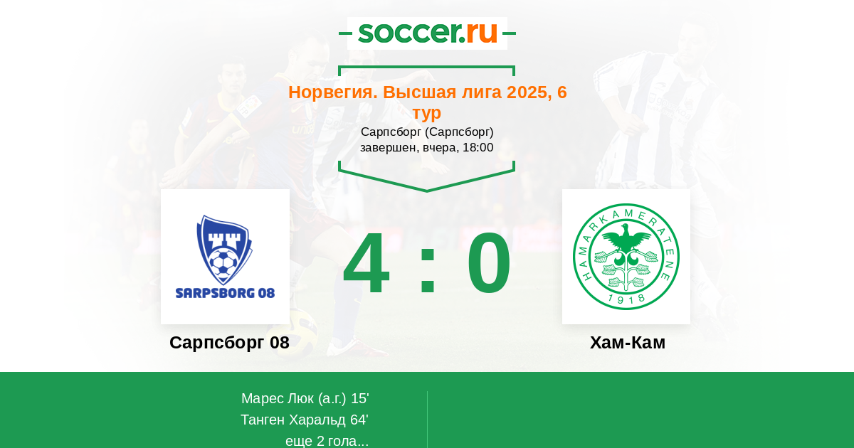 Норвегия. Высшая лига 31.08.2025 Хам-Кам Логотип футбольный клуб Хам-Кам (Хамар) 1:3 Логотип футбольный клуб Сарпсборг 08 Сарпсборг 08
