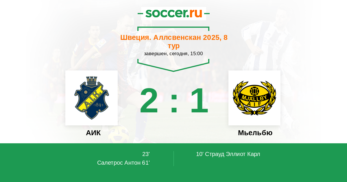 Швеция. Аллсвенскан 07.10.2023 АИК Логотип футбольный клуб АИК (Стокгольм) 1:0 Логотип футбольный клуб Мьельбю (Сельвесборг) Мьельбю