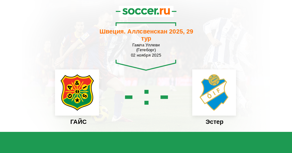 Швеция. Суперэттан 07.11.2021 Эстер Логотип футбольный клуб Эстер (Векше) 1:0 Логотип футбольный клуб ГАЙС (Гетеборг) ГАЙС