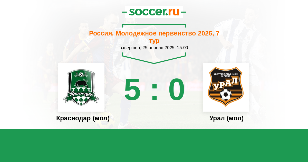 Россия. Премьер-Лига U21 28.04.2023 Краснодар (мол) Логотип футбольный клуб Краснодар (мол) 5:1 Логотип футбольный клуб Урал (мол) (Екатеринбург) Урал (мол)