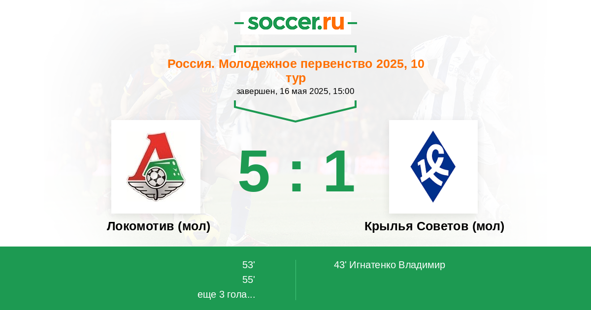 Россия. Премьер-Лига U21 10.04.2016 Крылья Советов (мол) Логотип футбольный клуб Крылья Советов (мол) (Самара) 0:2 Логотип футбольный клуб Локомотив (мол) (Москва) Локомотив (мол)