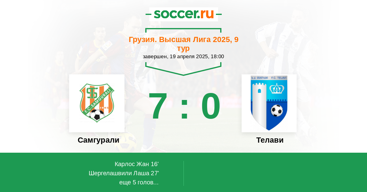 Грузия. Первый дивизион 21.04.2018 Самгурали Логотип футбольный клуб Самгурали (Цхалтубо) 1:2 Логотип футбольный клуб Телави Телави