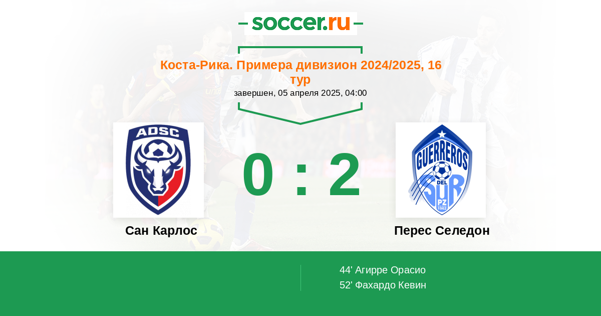 Коста-Рика. Примера дивизион 02.09.2012 Зеледон Логотип футбольный клуб Зеледон (Сан Исидро де Эль Хенерал) 2:1 Логотип футбольный клуб Сан Карлос (Сьюдад Куэсада) Сан Карлос