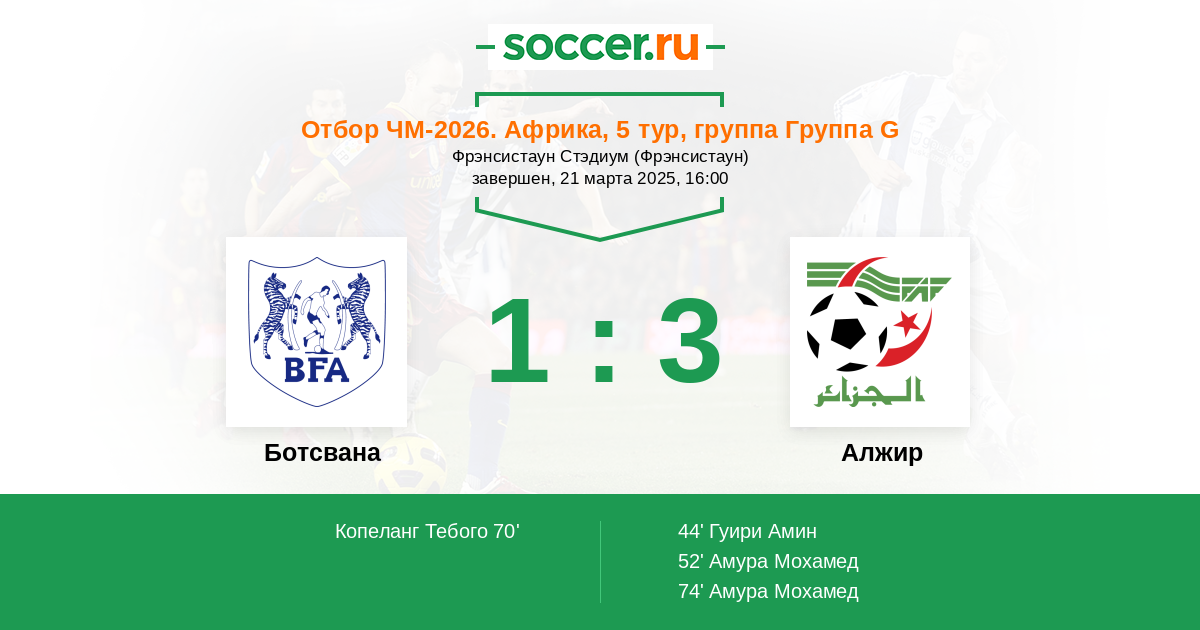 Ботсвана - Алжир ! Интересная ситуация сложилась в этой группе . Лидер Мозамбик до того так резко рванул в отрыв , что сегодняшним соперникам надо хорошо призадуматься , что бы по итогу не оказаться " на бобах " . ТБ .