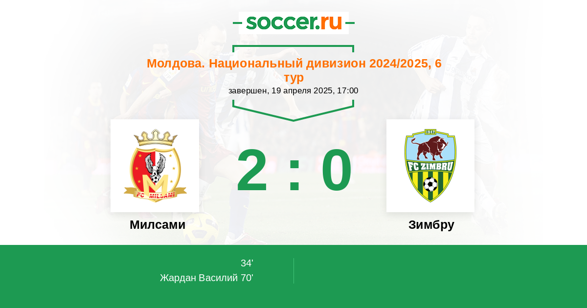 Молдова. Национальный дивизион 12.04.2019 Милсами Логотип футбольный клуб Милсами (Оргеев) 3:0 Логотип футбольный клуб Зимбру (Кишинев) Зимбру