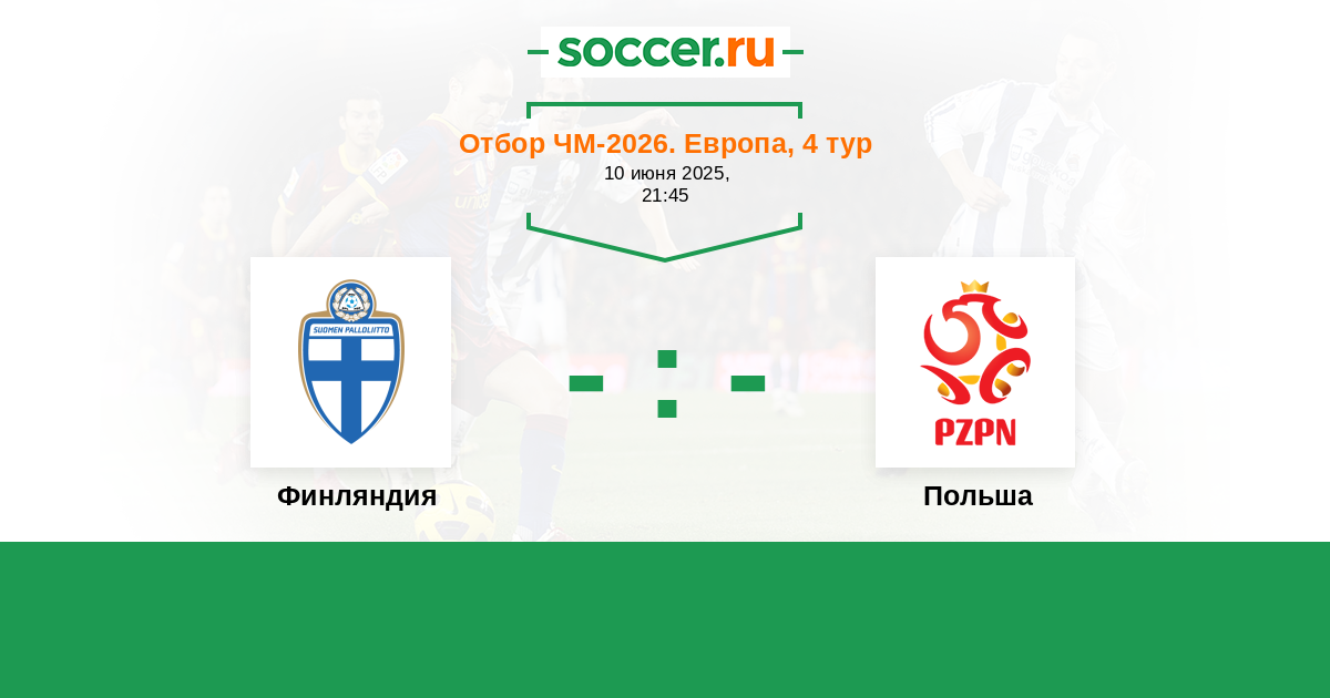 Отбор ЧМ. Европа 07.09.2025 Польша Логотип Польша 3:1 Логотип Финляндия Финляндия