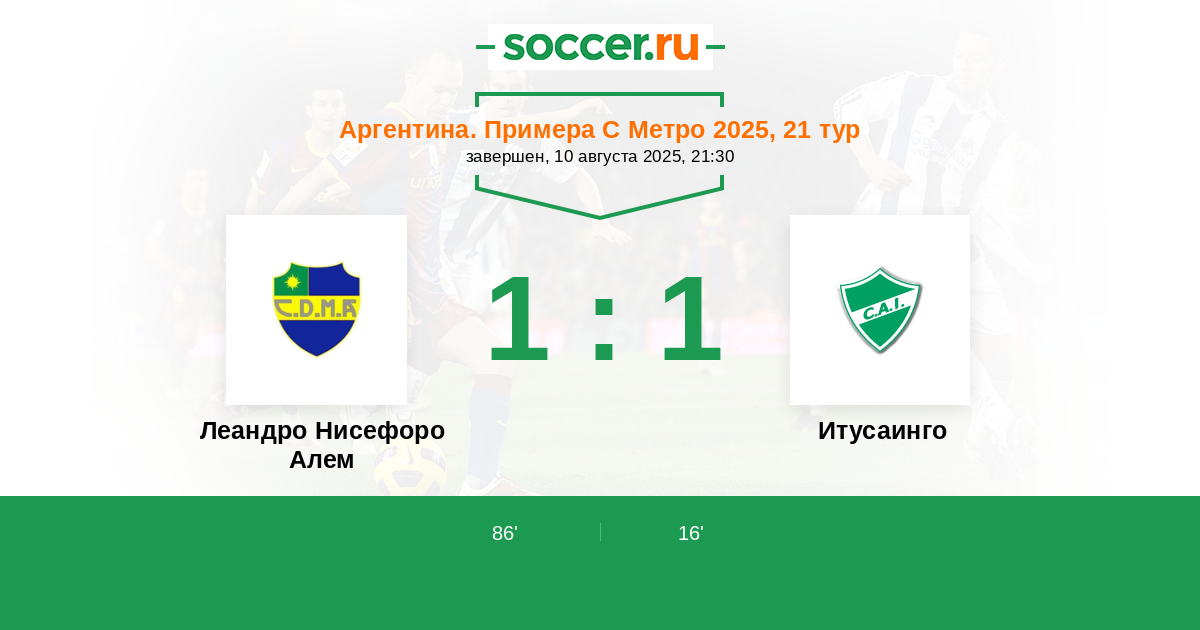 Аргентина. Примера С Метро 26.04.2025 Итусаинго Логотип футбольный клуб Итусаинго 2:1 Логотип футбольный клуб Леандро Нисефоро Алем (Буэнос-Айрес) Леандро Нисефоро Алем