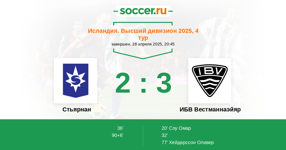Исландия. Высший дивизион 14.07.2025 ИБВ Вестманнаэйяр Логотип футбольный клуб ИБВ Вестманнаэйяр 1:0 Логотип футбольный клуб Стьярнан (Гардабайр) Стьярнан
