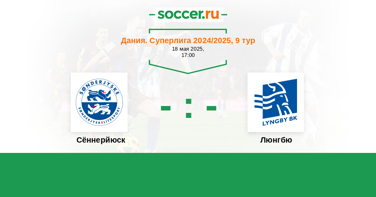 Дания. Суперлига 17.04.2025 Люнгбю Логотип футбольный клуб Люнгбю (Конгес Люнгбю) 0:2 Логотип футбольный клуб Сённерйюск (Хадерслев) Сённерйюск