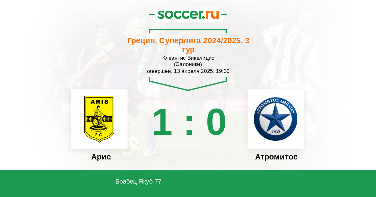 Греция. Суперлига 23.02.2022 Арис Логотип футбольный клуб Арис (Салоники) 3:0 Логотип футбольный клуб Атромитос (Перистери) Атромитос