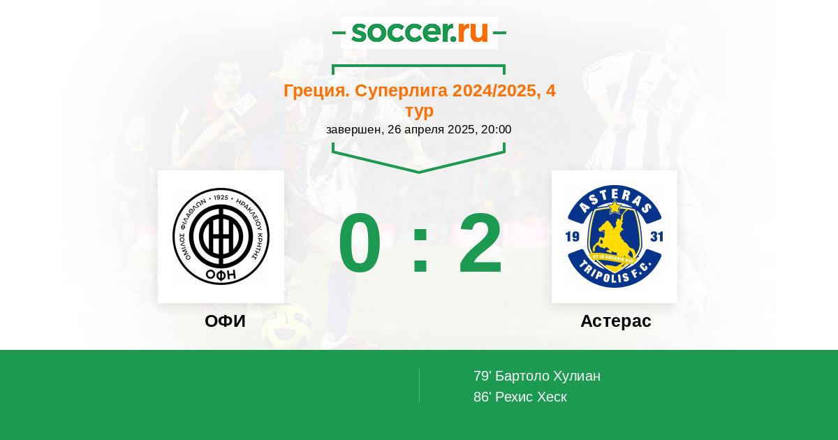 Греция. Суперлига 13.04.2025 Астерас Логотип футбольный клуб Астерас (Триполис) 2:1 Логотип футбольный клуб ОФИ (Ираклион) ОФИ