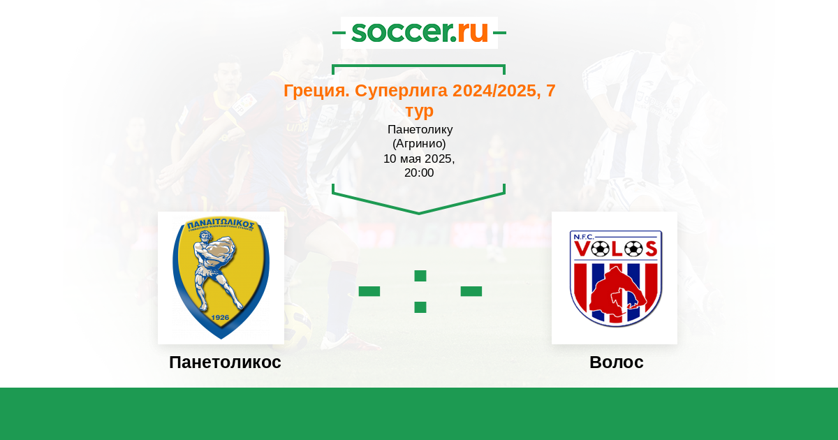 Греция. Суперлига 26.10.2024 Панетоликос Логотип футбольный клуб Панетоликос (Агринио) 0:1 Логотип футбольный клуб Волос Волос