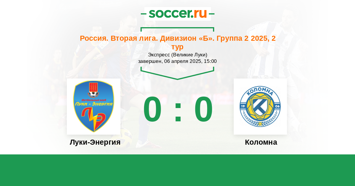 Россия. Вторая лига. Группа 2 27.04.2019 Коломна Логотип футбольный клуб Коломна 0:2 Логотип футбольный клуб Луки-Энергия (Великие Луки) Луки-Энергия