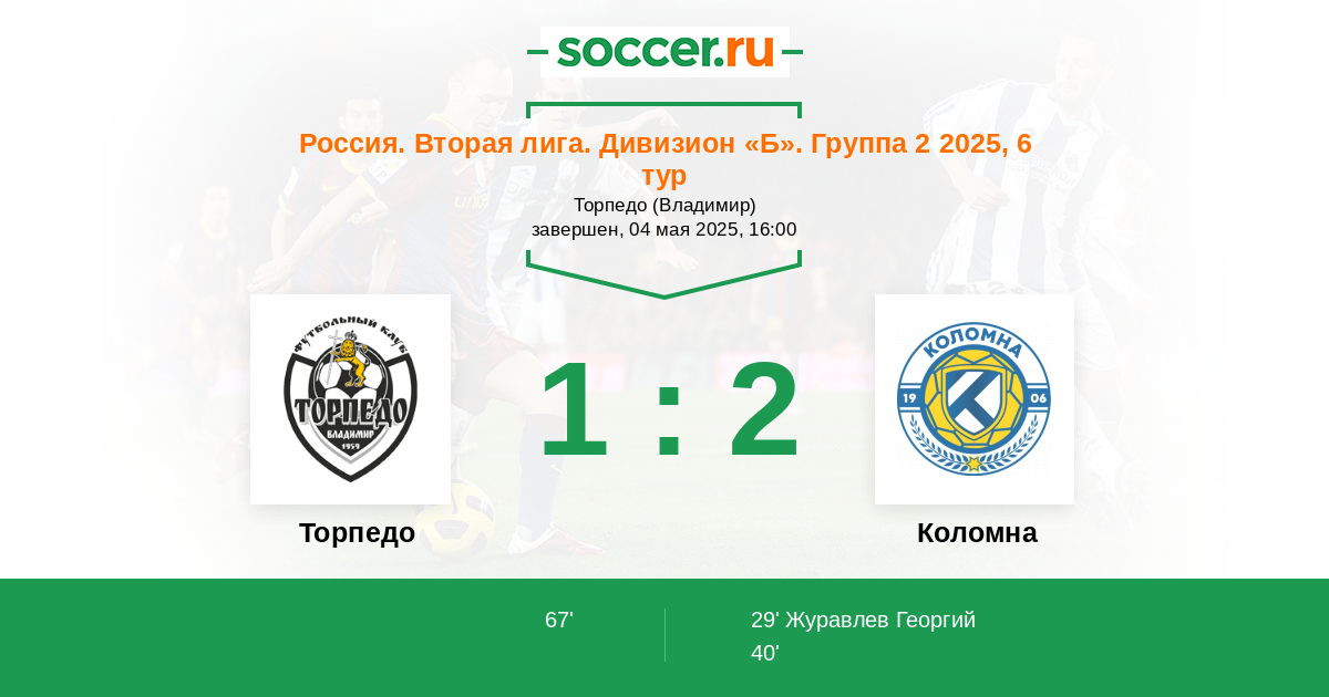 Россия. Вторая лига. Группа 2 05.05.2021 Коломна Логотип футбольный клуб Коломна 0:1 Логотип футбольный клуб Торпедо (Владимир) Торпедо