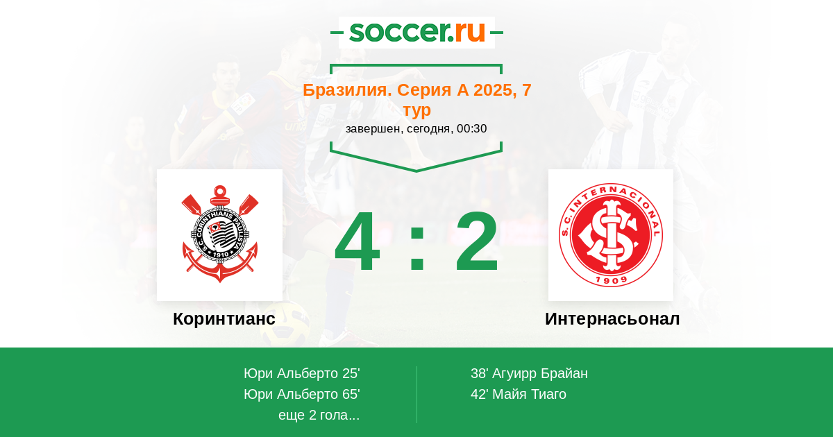 Бразилия. Серия А 02.10.2025 Интернасьонал Логотип футбольный клуб Интернасьонал (Порту-Алегри) 1:1 Логотип футбольный клуб Коринтианс (Сан-Паулу) Коринтианс