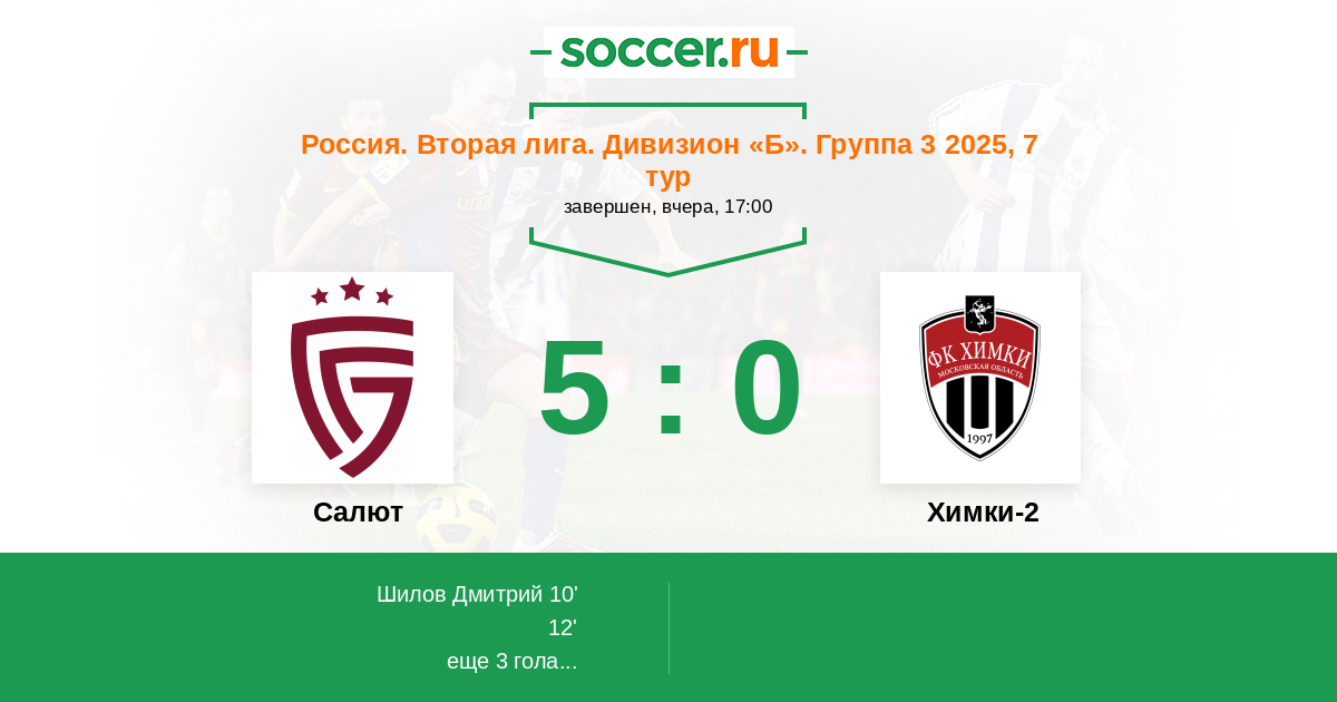 Россия. Вторая лига. Группа 3 27.09.2020 Салют Логотип футбольный клуб Салют (Белгород) 6:0 Логотип футбольный клуб Химки-2 Химки-2