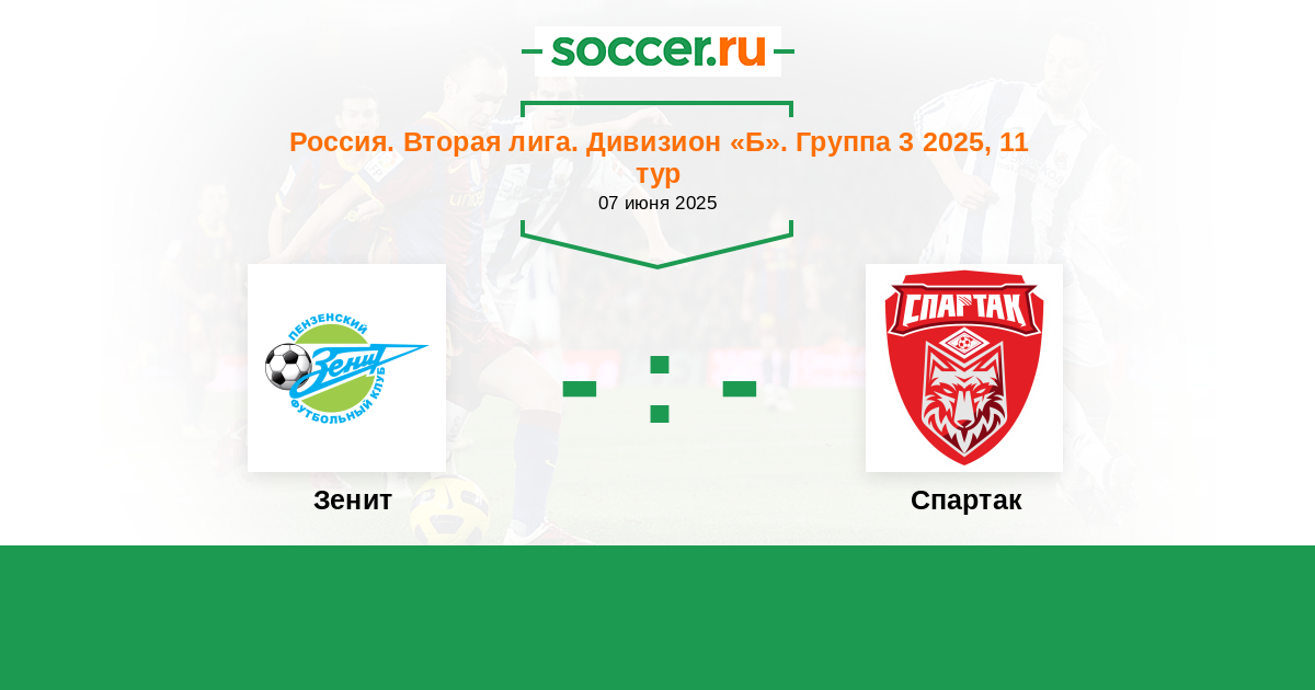 Россия. Вторая лига. Дивизион «Б». Группа 3 19.06.2024 Спартак Логотип футбольный клуб Спартак (Тамбов) 2:5 Логотип футбольный клуб Зенит (Пенза) Зенит