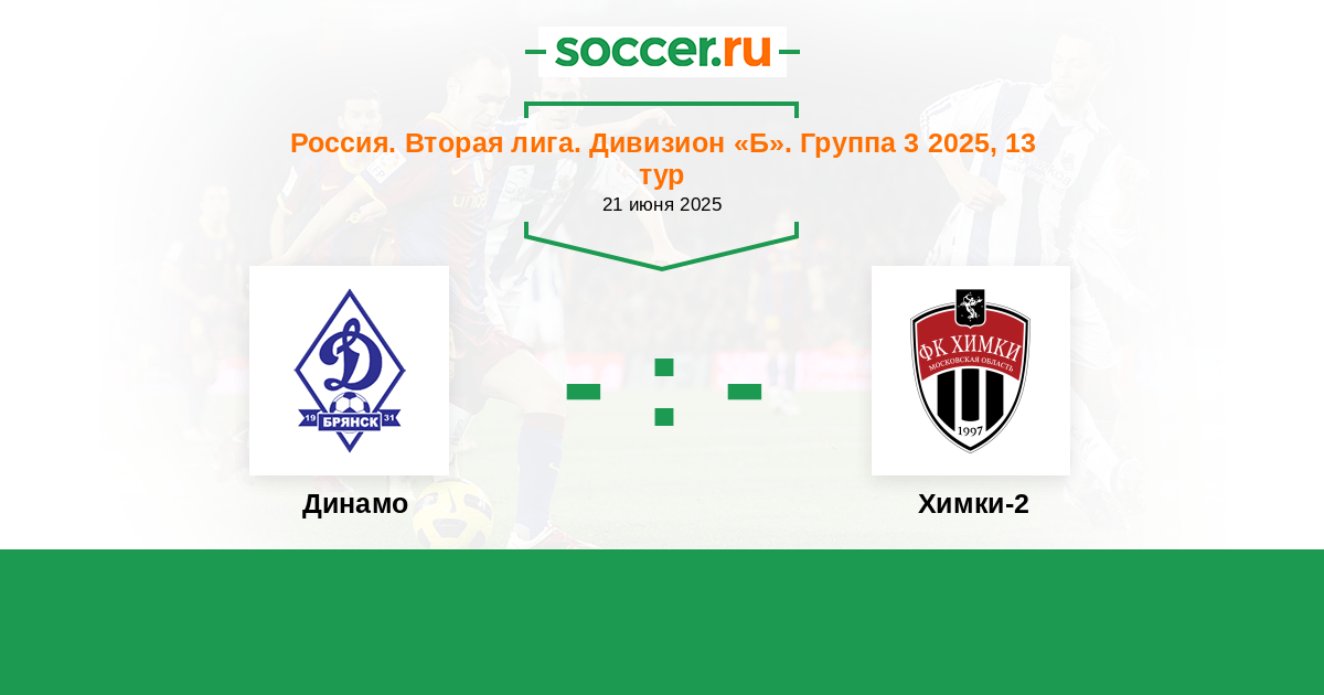 Россия. Вторая лига. Группа 3 25.08.2018 Химки-2 Логотип футбольный клуб Химки-2 0:3 Логотип футбольный клуб Динамо Брянск Динамо Брянск