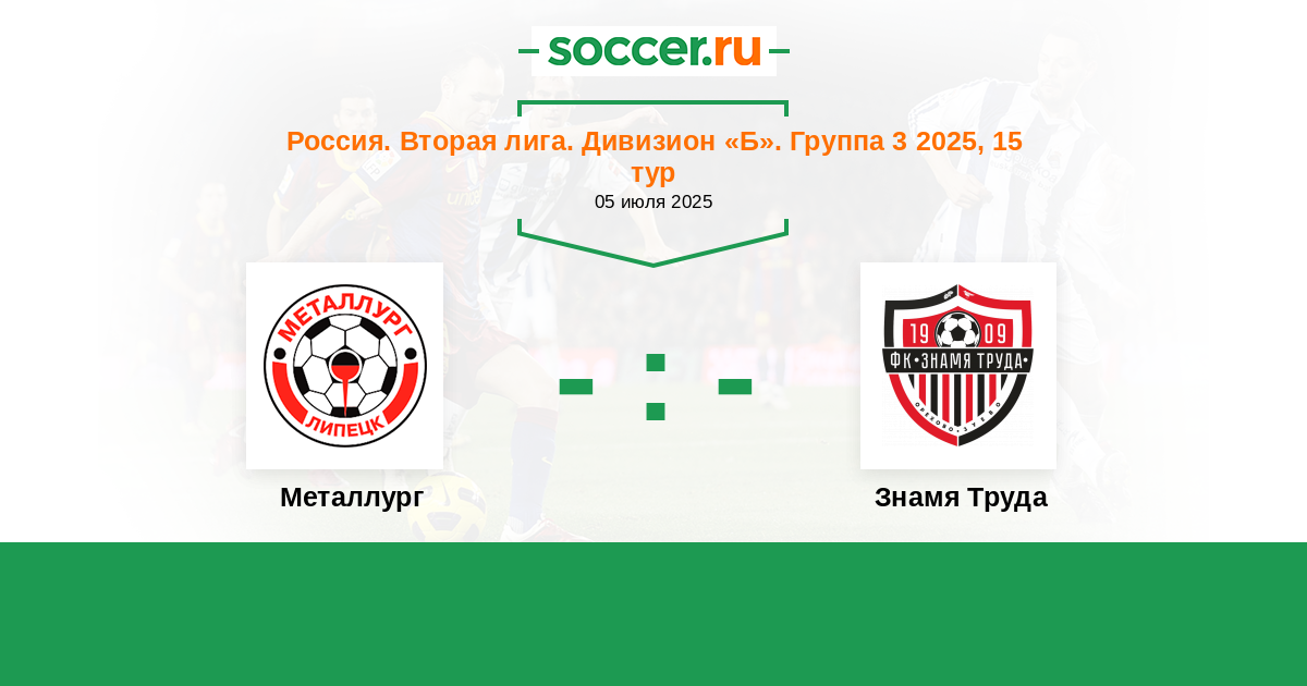 Россия. Вторая лига. Дивизион «Б». Группа 3 25.10.2025 Знамя Труда Логотип футбольный клуб Знамя Труда (Орехово-Зуево) 2:0 Логотип футбольный клуб Металлург (Липецк) Металлург