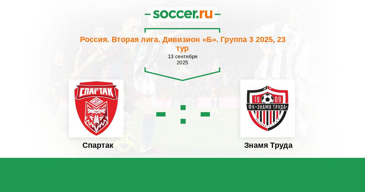 Россия. Вторая лига. Дивизион «Б». Группа 3 24.05.2025 Знамя Труда Логотип футбольный клуб Знамя Труда (Орехово-Зуево) 1:0 Логотип футбольный клуб Спартак (Тамбов) Спартак