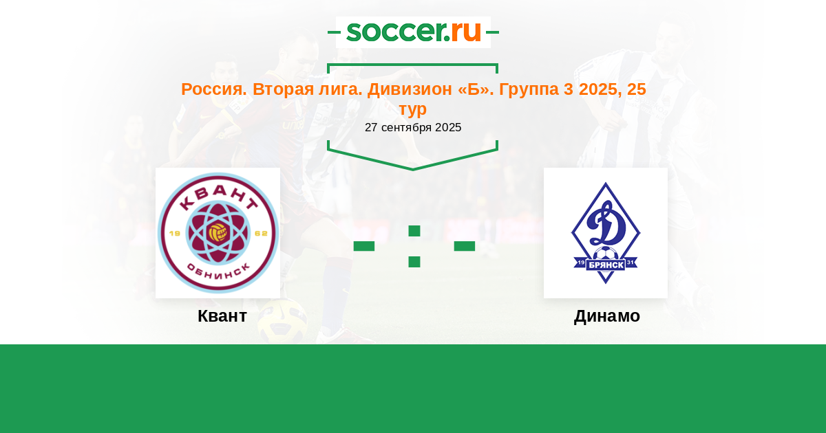 Россия. Вторая лига. Группа 3 15.10.2022 Квант Логотип футбольный клуб Квант (Обнинск) 0:2 Логотип футбольный клуб Динамо Брянск Динамо Брянск