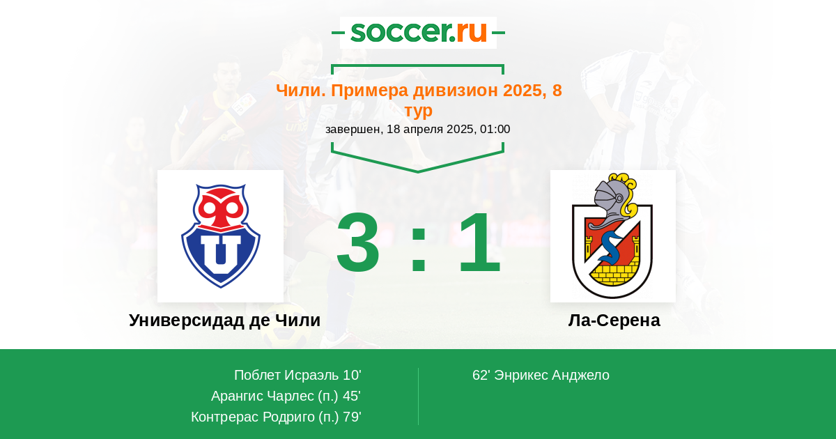 Чили. Примера дивизион 11.04.2021 Ла-Серена Логотип футбольный клуб Ла-Серена 0:0 Логотип футбольный клуб Универсидад де Чили (Сантьяго) Универсидад де Чили