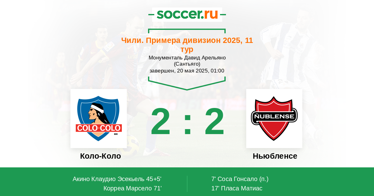 Чили. Примера дивизион 31.05.2022 Коло-Коло Логотип футбольный клуб Коло-Коло (Сантьяго) 0:0 Логотип футбольный клуб Ньюбленсе (Чильян) Ньюбленсе
