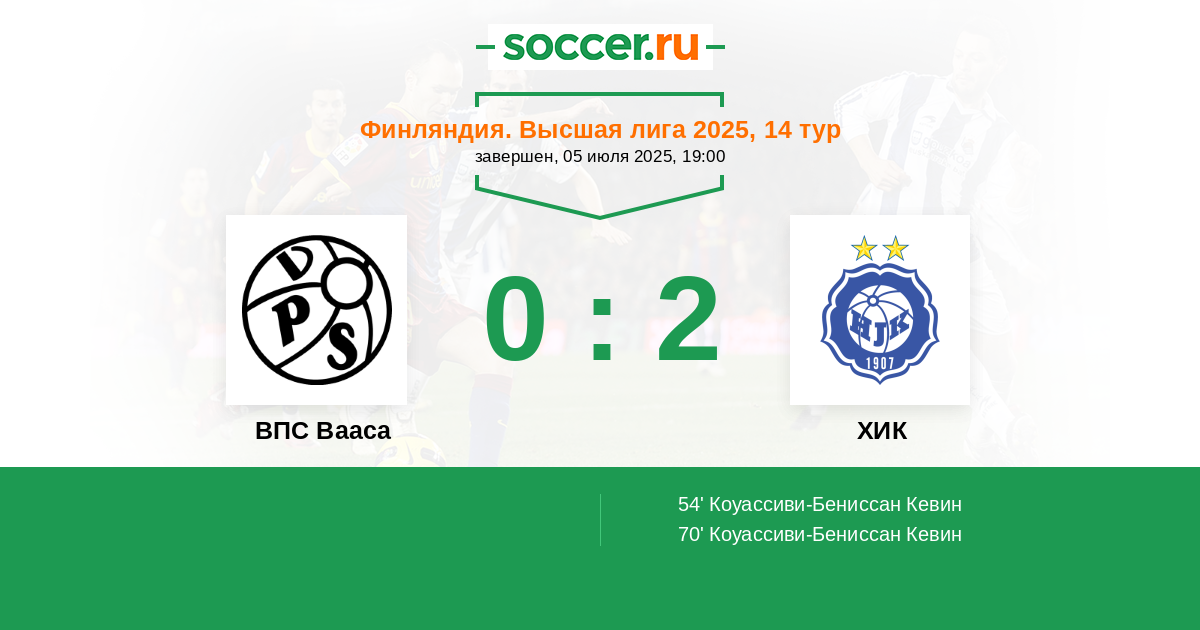 Финляндия. Высшая лига 16.07.2022 ХИК Логотип футбольный клуб ХИК (Хельсинки) 3:1 Логотип футбольный клуб ВПС Вааса ВПС Вааса