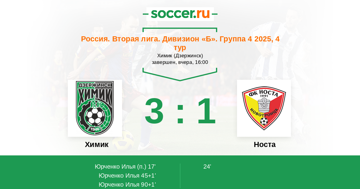 Россия. Вторая лига. Дивизион «Б». Группа 4 10.08.2025 Носта Логотип футбольный клуб Носта (Новотроицк) 2:5 Логотип футбольный клуб Химик (Дзержинск) Химик