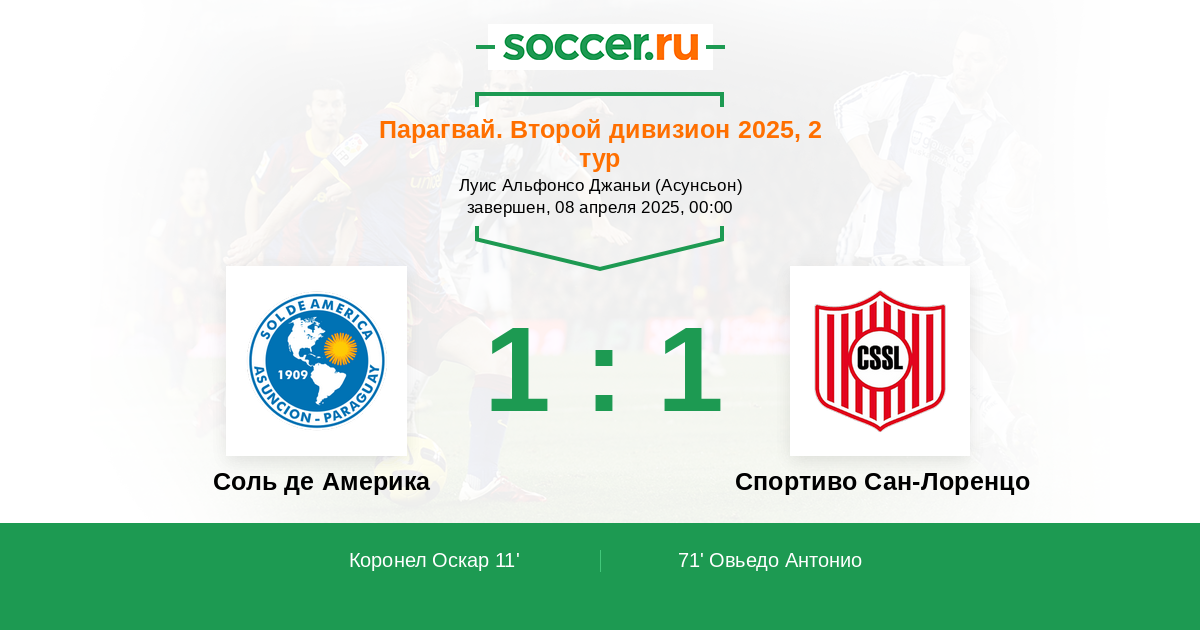 Парагвай. Второй дивизион 14.07.2025 Спортиво Сан-Лоренцо Логотип футбольный клуб Спортиво Сан-Лоренцо 0:0 Логотип футбольный клуб Соль де Америка (Асунсьон) Соль де Америка