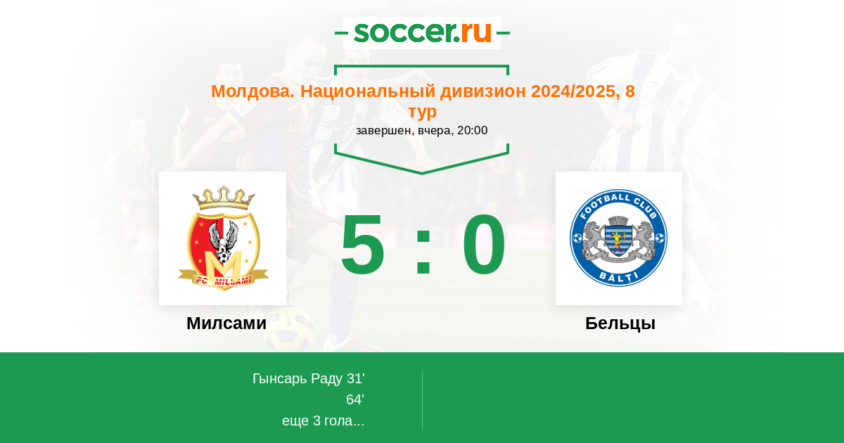 Молдова. Национальный дивизион 29.03.2025 Бельцы Логотип футбольный клуб Бельцы 0:2 Логотип футбольный клуб Милсами (Оргеев) Милсами