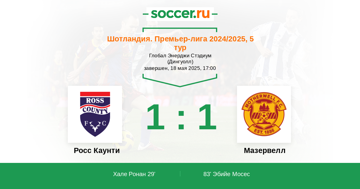 Шотландия. Премьер-Лига 02.05.2015 Мазервелл Логотип футбольный клуб Мазервелл 1:1 Логотип футбольный клуб Росс Каунти (Дингволл) Росс Каунти